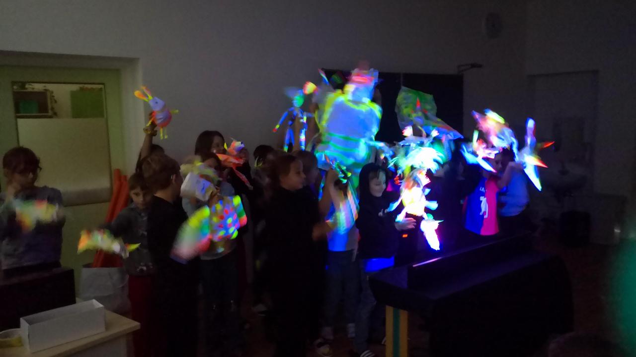 Letztendlich wurden die einzigartigen Unikate zu einer gemeinsamen Geschichte verflochten, während uns die Kinder verzauberten mit ihren hell erleuchteten, farbenfrohen Figuren und Objekten, die sie wie durch Geisterhand durch den dunklen Raum schweben ließen.