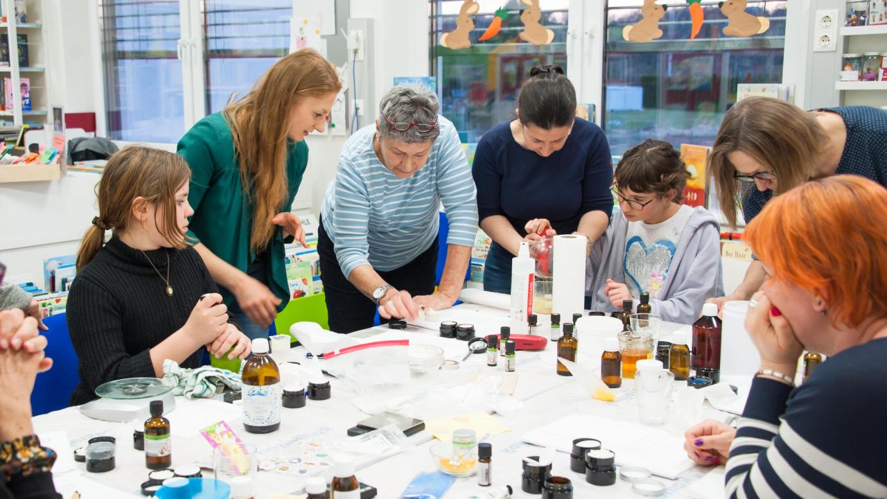 Am Samstag, dem 28. März, waren die Osterhasen-Helfer richtig fleißig am Rühren und Mixen in unserer Bücherei. Unsere Küche wurde nämlich zur Naturkosmetik-Rührwerkstatt umfunktioniert. Wunderbar duftende Badebomben, erfrischende Deos und pflegende Salben standen am Programm – alles über das man sich ganz besonders im Osternest freut.